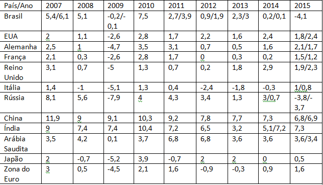 obs. 1: Índices do Brasil dos anos 2014 e 2015 – Fonte: Wikipedia em https://pt.wikipedia.org/wiki/Evolu%C3%A7%C3%A3o_do_PIB_do_Brasil. Todos os valores apresentados após a barra são os índices de crescimento do PIB publicados no site espanhol Datosmacro.com. O Brasil tinha um PIB de R$5,9 trilhões, no fim de 2015, o 9º PIB mundial.